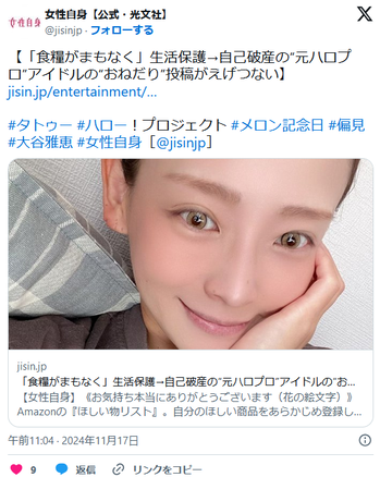 “ある女性”とは、元ハロプロ『メロン記念日』のメンバー・大谷雅恵(42)。