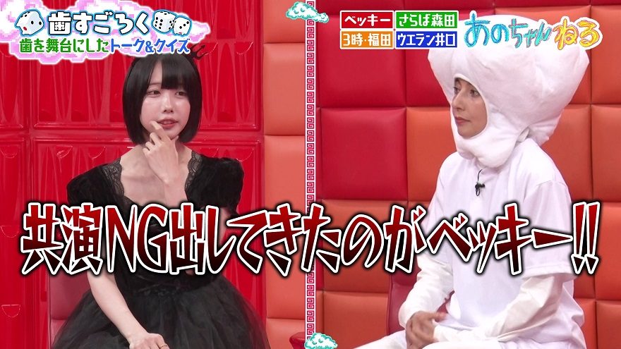 答えは「ベッキー」で、その理由を「ベッキーさんのXをフォローしたら、本当しょうもないことしかつぶやかないんで、ミュートしたんです。それをテレビで言ったら、“共演NG”って言われて」と明かした。しかし、11月11日深夜放送の同番組にベッキーがゲスト出演したことにも触れ「でも、来てくれたの」と話すと「じゃあ好きにならないと」と言われうなずいていた。