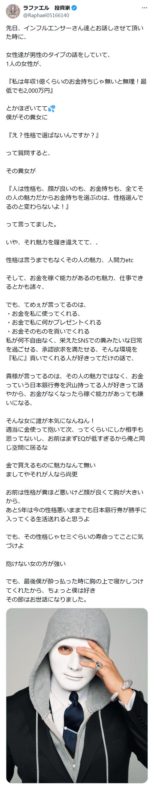 ラファエルは「いや、それ魅力を履き違えてて、、性格は言うまでもなくその人の魅力、人間力etc そして、お金を稼ぐ能力があるのも魅力、仕事できるとかも諸々、でも、てめぇが言ってるのは、・お金を私に使ってくれる ・お金で私に何かプレゼントくれる ・お金そのものを貢いでくれる 私が何不自由なく、栄えたSNSでの*みたいな日常を過ごせる、承認欲求を満たせる、そんな環境を『私に』貢いでくれる人が好きってだけの話で」と異を唱えた。