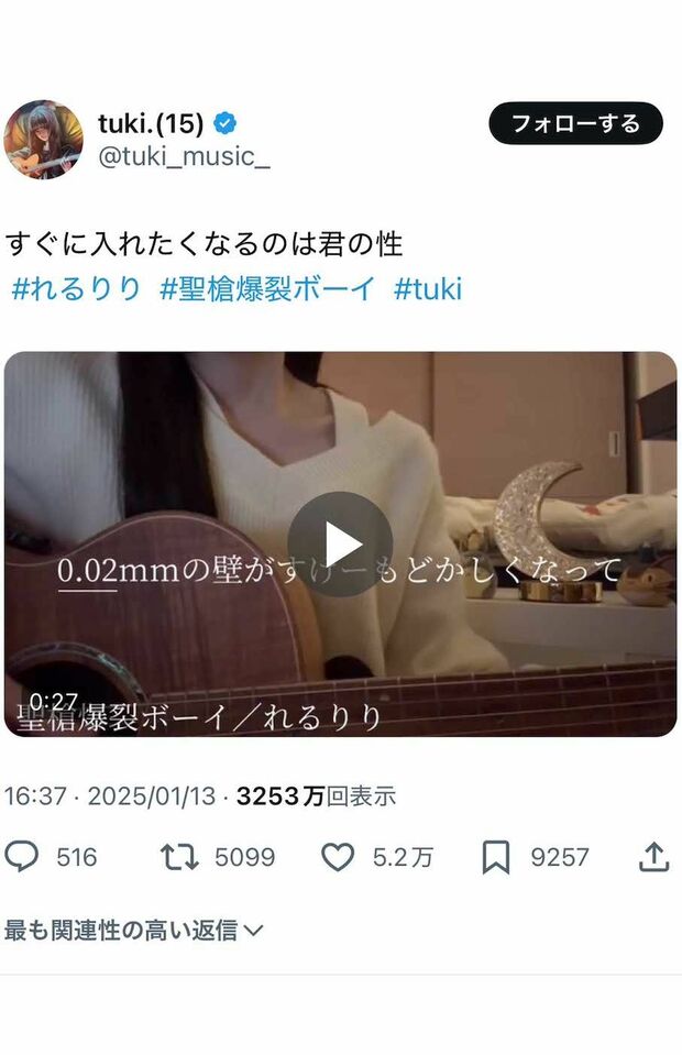 「1月13日の夕方には、ギターの弾き語り動画を投稿しました。歌っていたのは『れるりり』というボカロPの『聖槍爆裂ボーイ』という曲。この曲は《0.02mmの壁がすげーもどかしくなって》《すぐに入れたくなるのは君の性》といった、性行為を連想させる歌詞で構成されています」(前出・音楽ライター)https://news.livedoor.com/article/detail/27959939/
