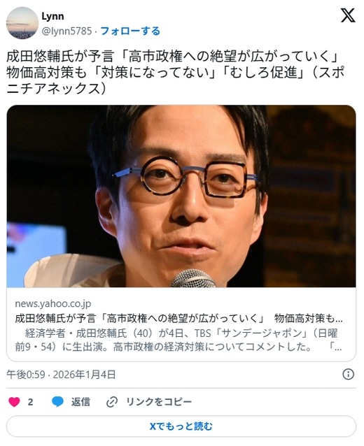 (出典 【テレビ】成田悠輔氏が予言「高市政権への絶望が広がっていく」 物価高対策も「対策になってない」「むしろ促進」 [冬月記者★])